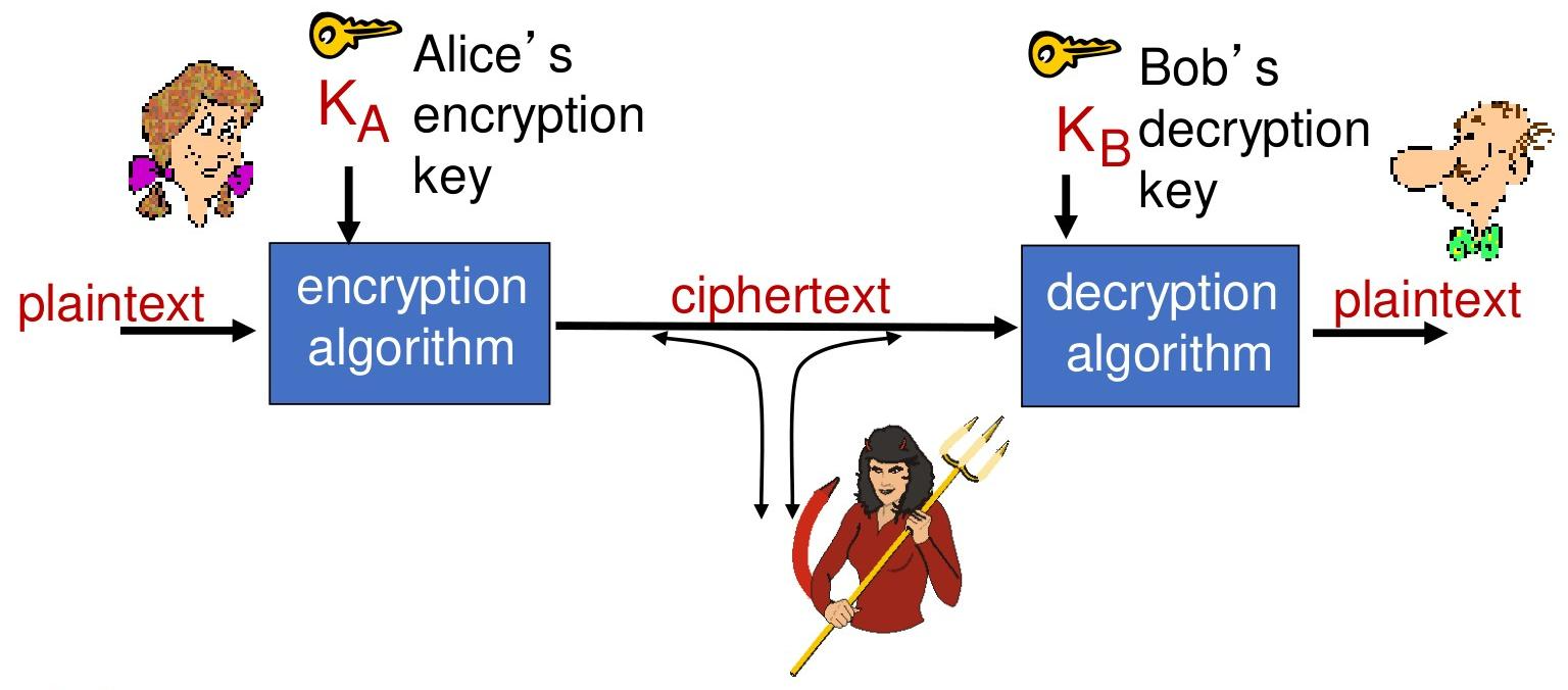 - 加密算法要求:需要满足特定的条件,即给定公钥 $K_{B}^{+}$ ,无法计算出私钥 $K_{B}^{-}$ ,并且使用公钥加密的消息可以通过私钥正确解密,反之亦然。