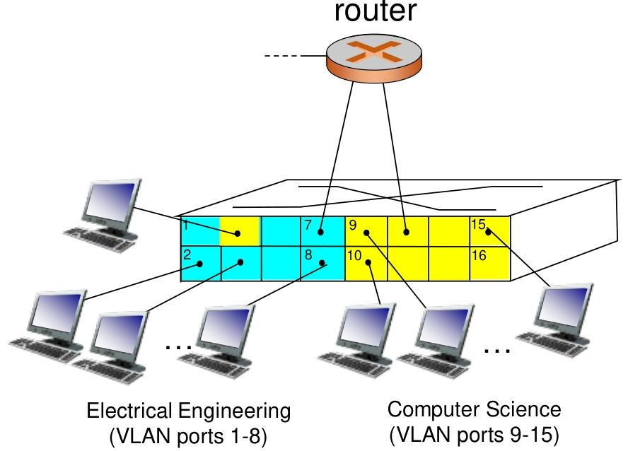 - 端口分组:交换机端口可以被分组(由交换机管理软件完成),使得单个物理交换机可以像多个虚拟交换机一样工作。例如,可以将一些端口配置为属于计算机科学VLAN,另一些端口属于电气工程VLAN。